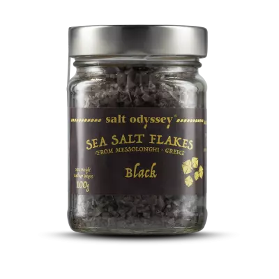 Salt Odyssey Φυσικό Θαλασσινό Αλάτι Μεσολογγίου με Μελάνι Σουπιάς – Πυραμιδοειδείς Νιφάδες σε Γυάλινο Βάζο 100g
